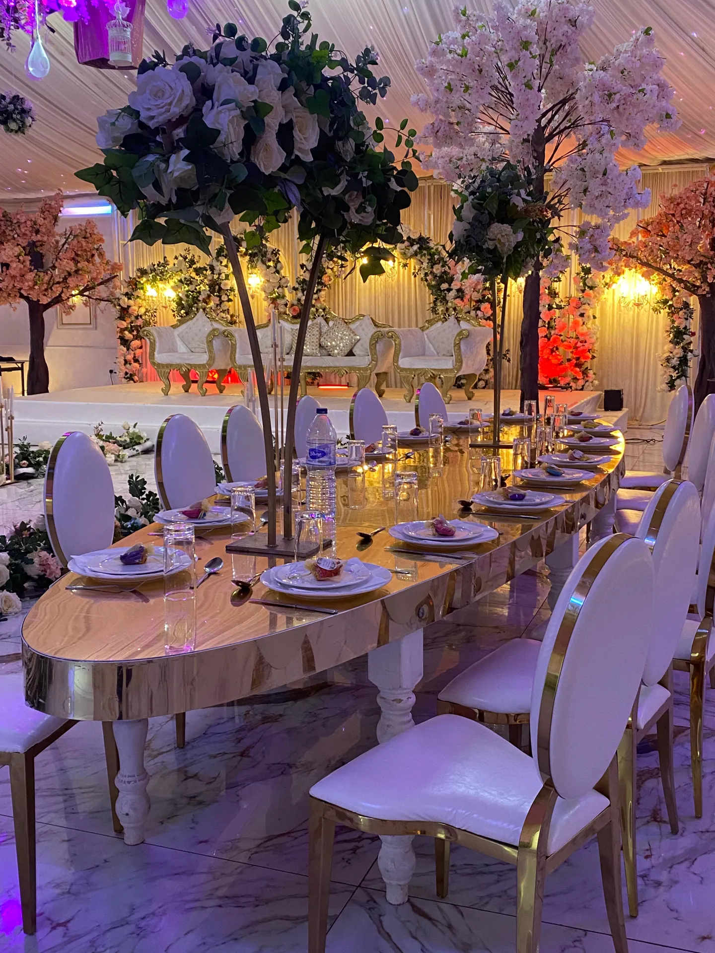 Simple but elegant stage range complimented by marble glass vases and blossom trees. Mood lighting, luxury bridal suite access and welcome drinks for guests upon arrival.